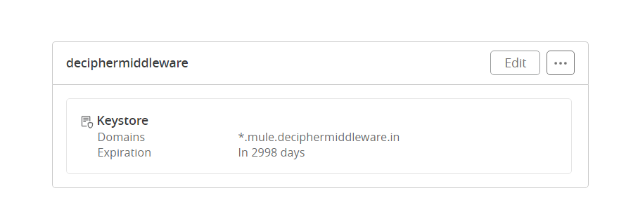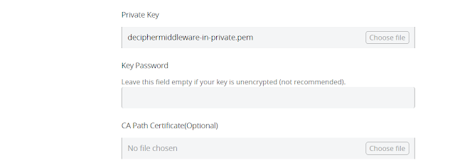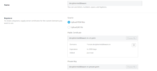 4. Enter the name for configuration. Upload the public certificate and the private key created in the previous steps. Certificates have been configured to have domains as *.mule.deciphermiddleware.in