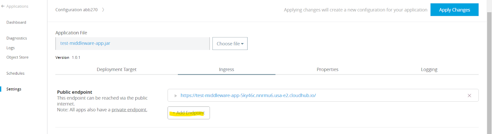 8. Open any CloudHub 2.0 application deployed in the Private Space. Go to settings. Click on Ingress , and click on Add Endpoint.