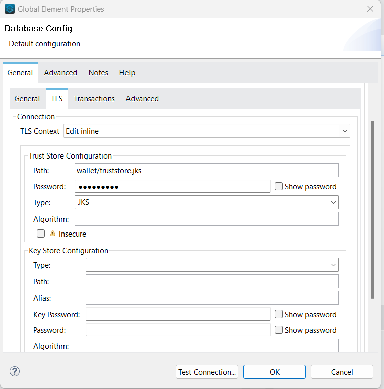 Once TLS is enabled at Oracle Cloud Autonomous database, we can configure TLS. The only difference in the configuration will be to use only the trust store instead of configuring both the key store and the trust store.