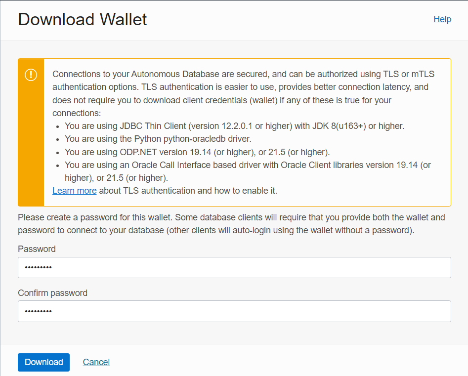 3. Enter the wallet password (and make a note of it, which will be used in later steps)and click on Download. The wallet.zip file will be downloaded.