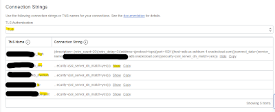 3. There will be 5 TNS(database service names) names available: high, low, medium, tp, and tpurgent. Click on the show, the TNS we may want to use, and copy the string. The string will contain all the details like host, port, service name, etc.
