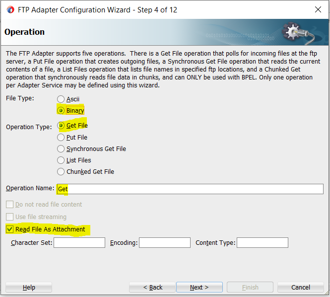 5. Select operation type as Get File. Check the Read File As Attachment. If we know the character set, encoding, and Content-Type of the file, then specify else leave it blank. Click Next.