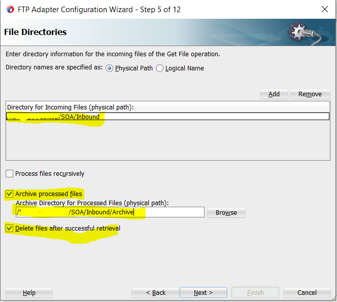 6. Specify the input directory from where we want to pick the file from. Check Archive processed files , and specify a directory for archive files if we want to archive the data after processing. Check Delete files after successful retrieval if we want to delete the file after processing. Click Next.