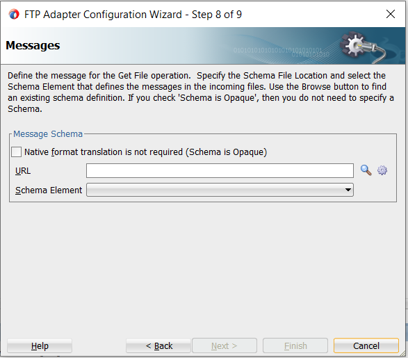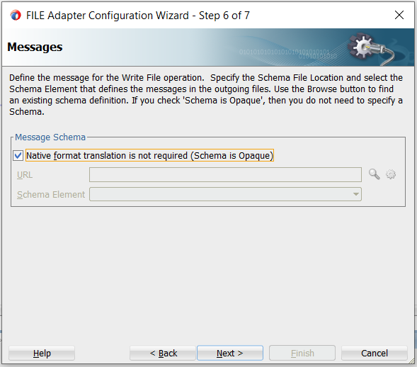 19. Specify the schema, if you don’t have any schema and want to read data as opaque then select “Native format translation not required”. In this example, we will be using an opaque schema and will not convert the data to XML by providing any schema. Click on Next. Then click on Finish.