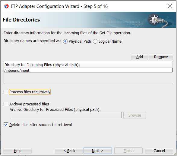 6. Specify the input directory, from where we want to poll files. For e.g. “/inbound/input”. Uncheck, if you don’t want to process files recursively. If you want to delete the file from a remote location, then check “Delete files after successful retrieval”.