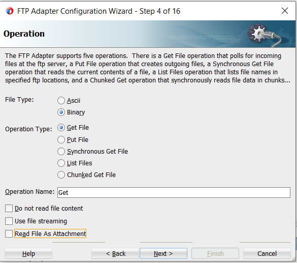 5. Specify the file type - Binary or ASCII. Select Operation type as Get File. Click Next.