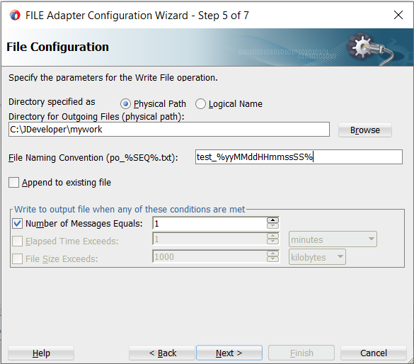 18. Provide the physical or logical directory and file naming convention(e.g. test_%yyMMddHHmmssSS%). Click on Next.