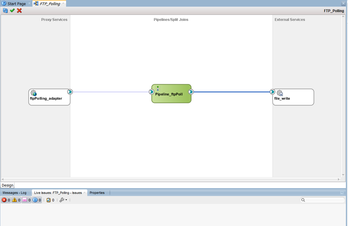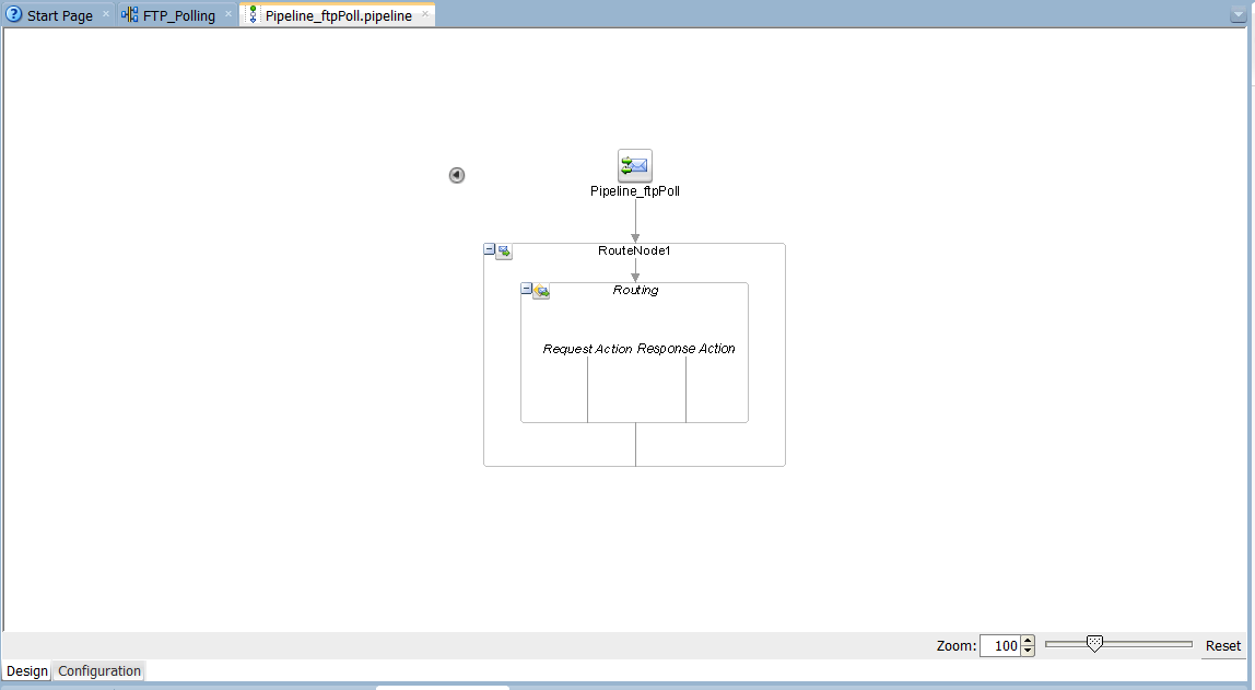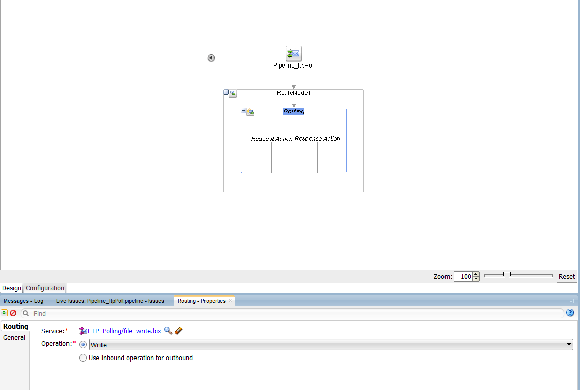 21. Double click on the pipeline. The pipeline window will open. You will see, the route node is already created and configured with the file write business service. Click on routing to check for properties.