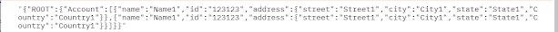 {"ROOT":{"Account":[{"name":"Name1","id":"123123","address":{"street":"Street1","city":"City1","state":"State1","Country":"Country1"}},{"name":"Name2","id":"124234","address":{"street":"Street2","city":"City2","state":"State2","Country":"Country2"}}]}}