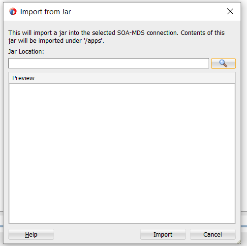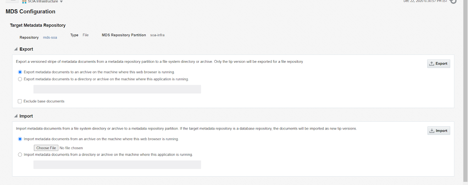 - On this page, we can import or export the MDS repository in the .jar file. To export click on export. A zip file with the name “soa-infra_metadata.zip” will be downloaded. Similarly, to import the jar or zip file click on import.