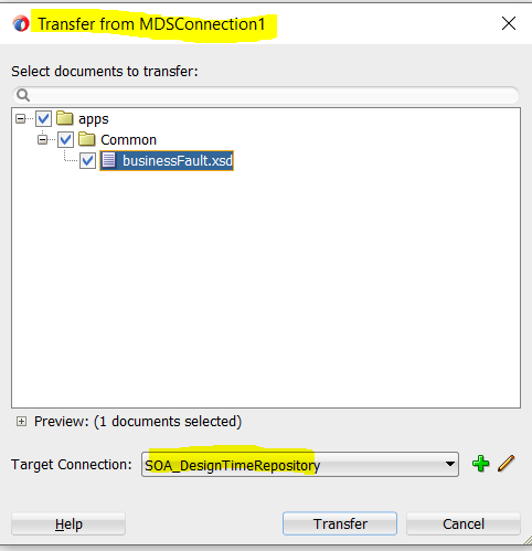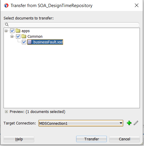 - Similarly, to transfer files from SOA server MDS repository to SOA_DesignTimeRepository. Right-click MDSConnection1 and select transfer. Specify the files and click transfer. Here in this case target Connection will be SOA_DesignTimeRepository.