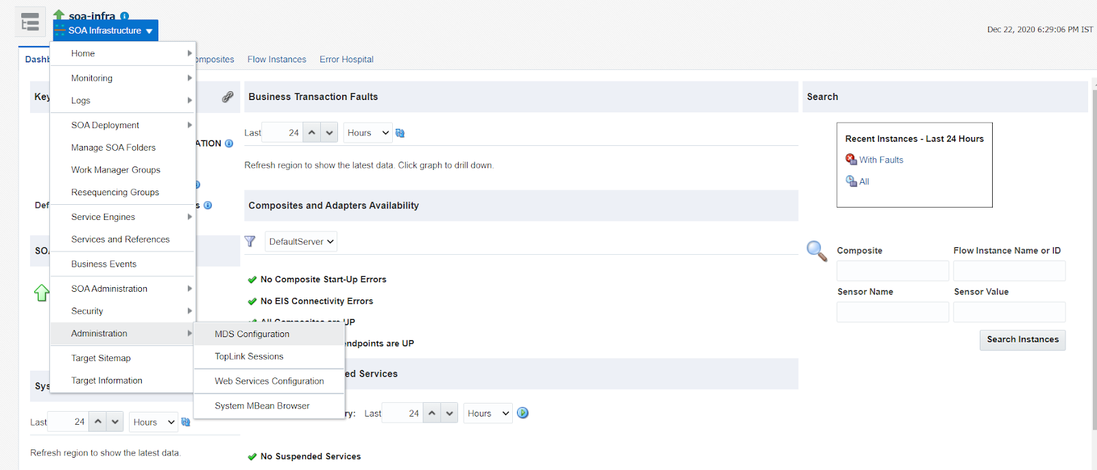 - Click on SOA Infrastructure. A Dropdown menu will appear. Click on Administration and then click on MDS Configuration