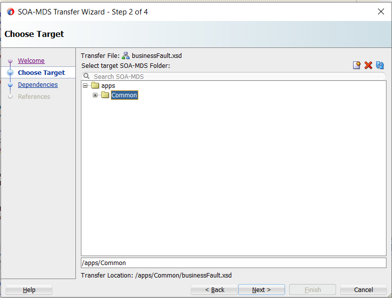 - Select the folder in which you want to place the file. For e.g. ‘/apps/Common’. Click Next.