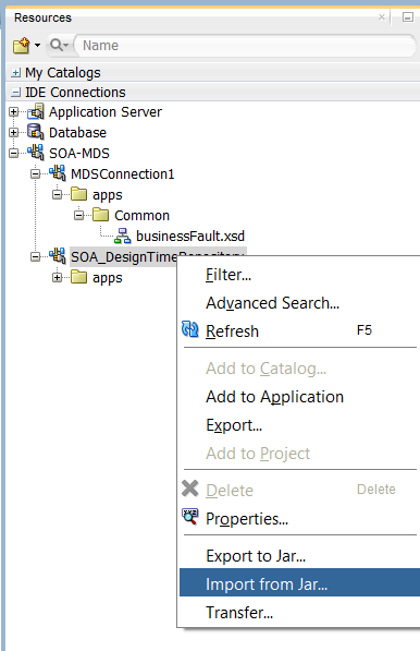 - To import this file in Jdeveloper, right-click on SOA_DesignTimeRepository and click on import from Jar. In case you want to export the file click on Export the Jar and specify the file name.