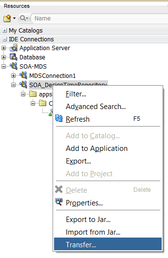 - Right-click on the SOA_DesignTimeRepository and then select transfer.