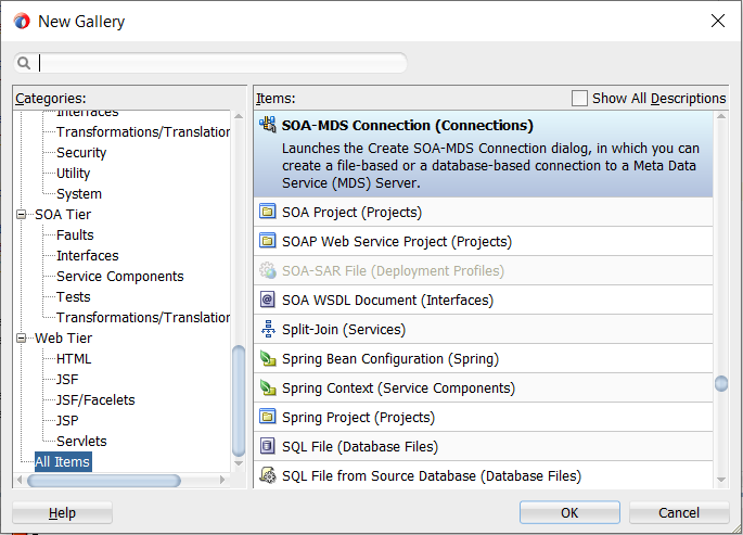 - Click on File. Click on New. Under all items select SOA-MDS connection. Click Ok