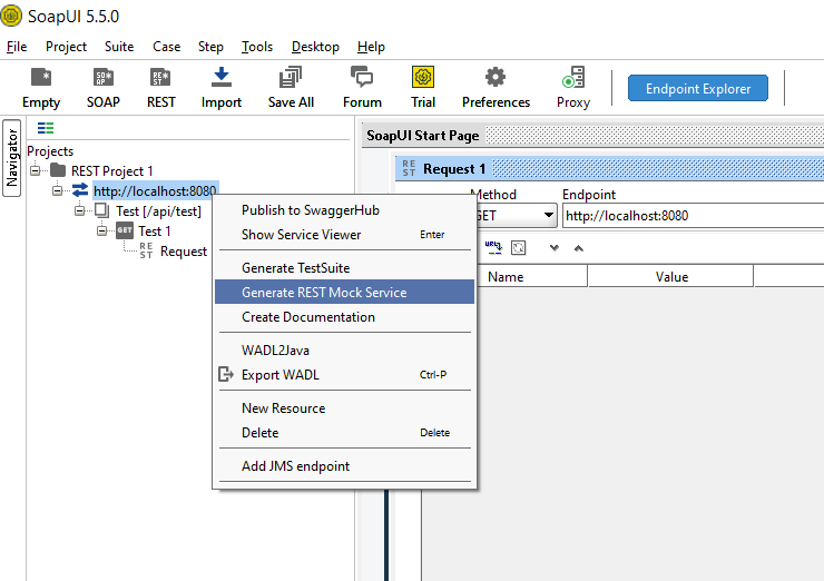 3. Once the project is created, right click on host name(http://locatlhost:8080) under REST Project 1 and then click on Generate REST Mock Service.