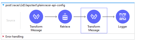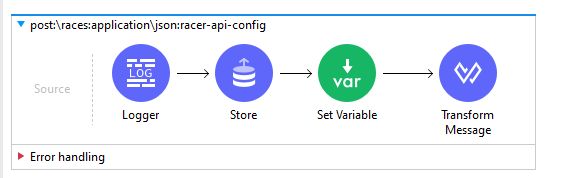 9. Click on Message flow to go back to flows. Go to “post:\races:application\json:racer-api-config " flow configuration.