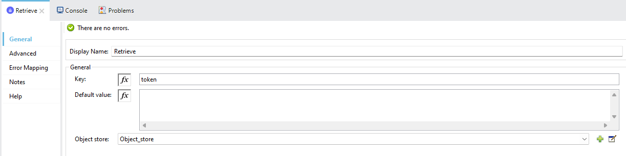 14. Drag the Retrieve connector under ObjectStore from Mule Palette, and place it after the transform message. Specify the values as shown below. Token value will be retrieved from the Object store.