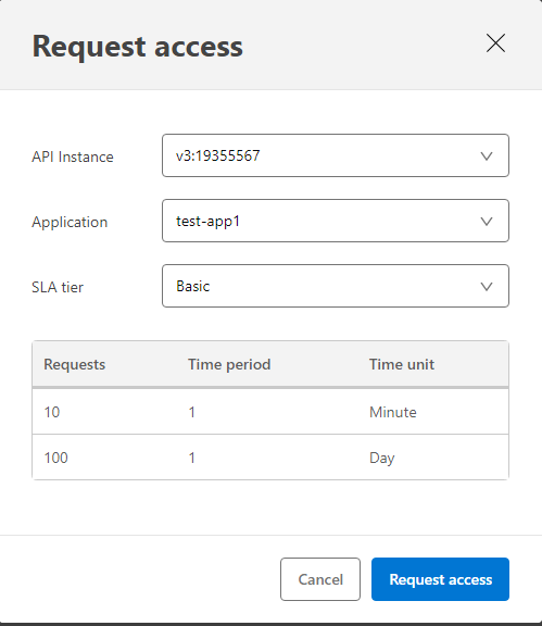 2. Fill in the details as shown below. If an application is not seen, create a new application by providing the name. Click on Request access. For initial access use the Basic SLA tier.