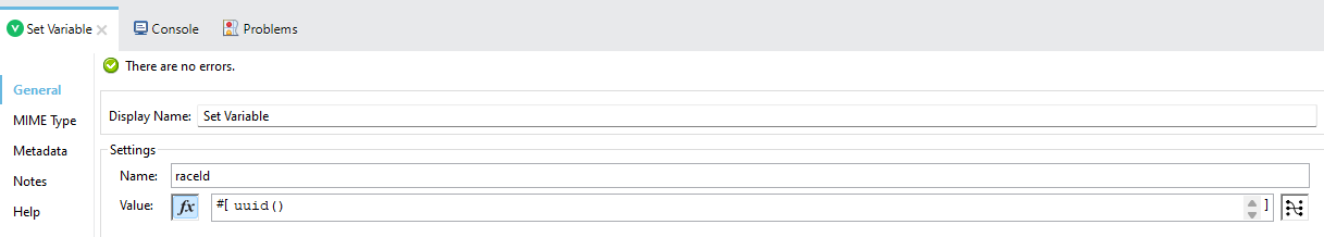 11. Drag a set variable and set the name as raceId and value as uuid(). Configuration should look like as below.