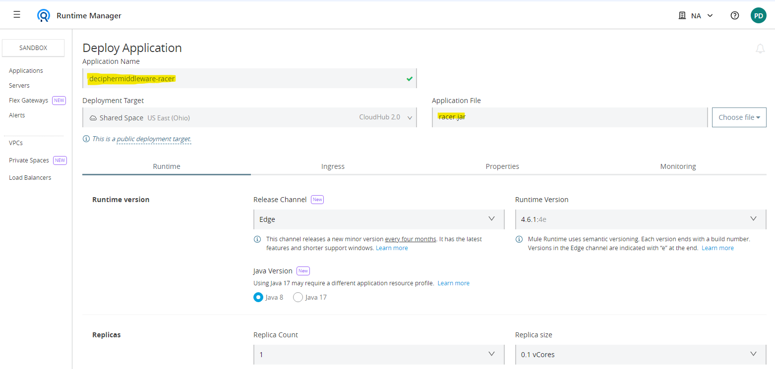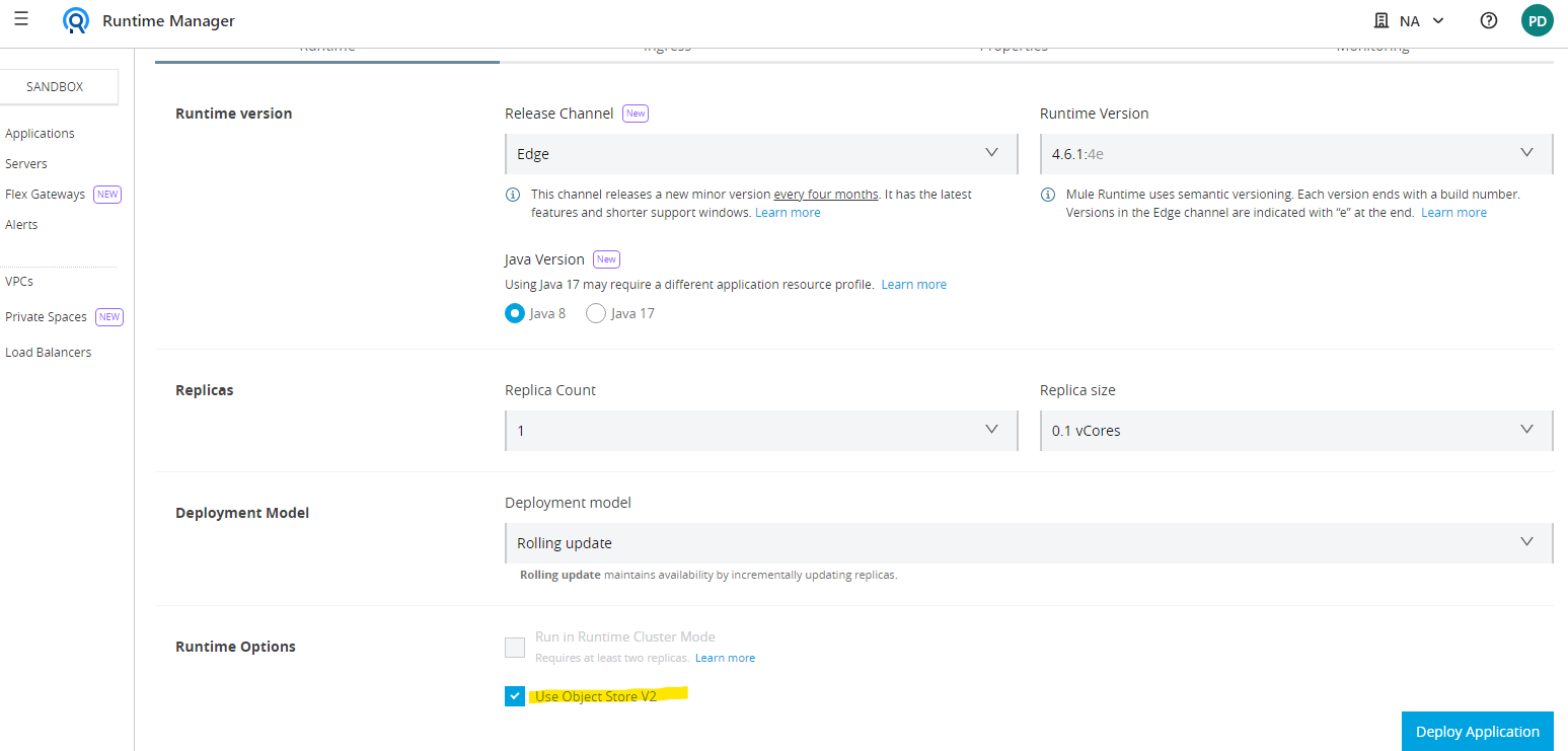 18. Go to the AnyPoint platform, then to Runtime Manager, select the environment where you want to deploy. Click on Deploy application.