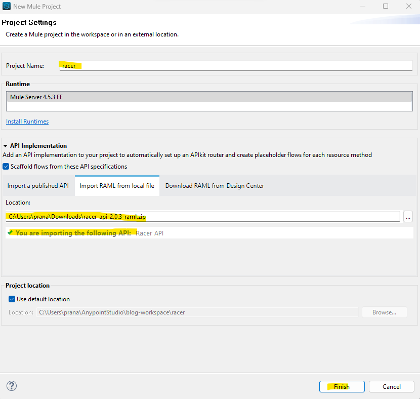 3. Enter the project/racer name, specify the downloaded file’s location, and click on finish.