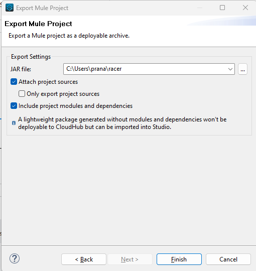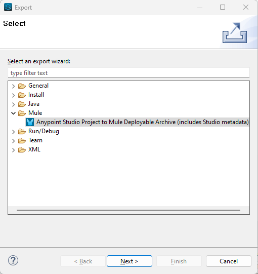 16. Save and export the API. Right-click racer project -> Export. Under Mule, select Anypoint Studio Project to Mule deployable archive. Click Next.