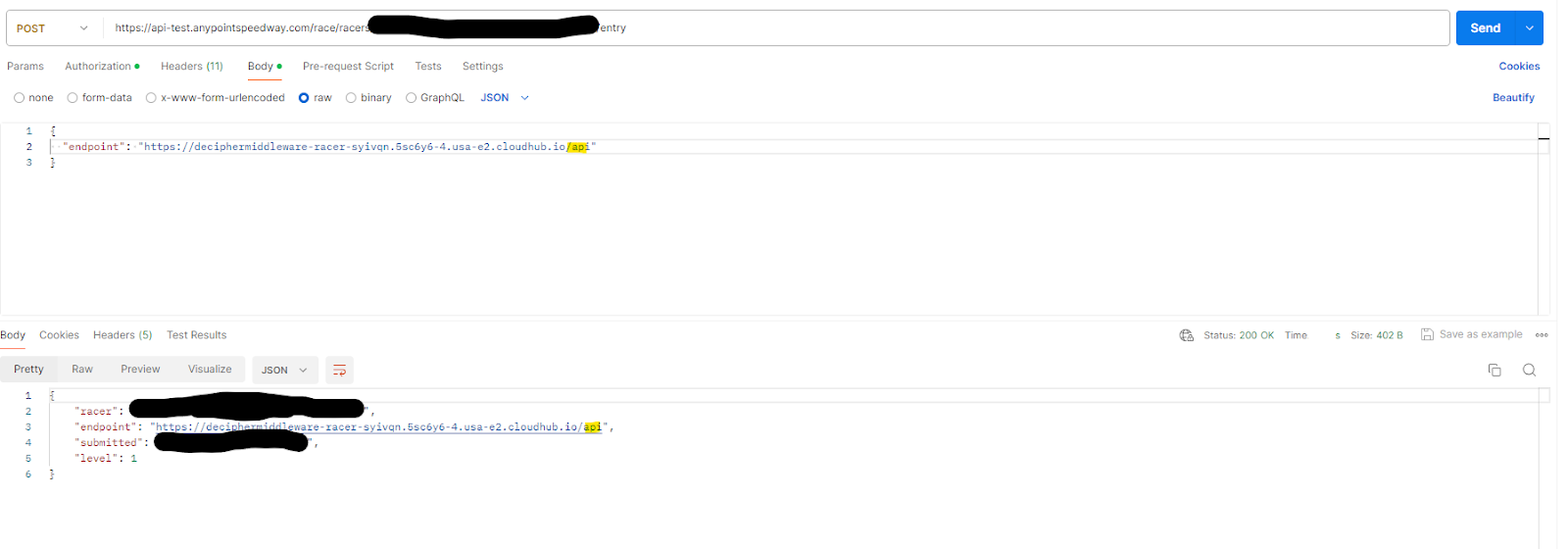 1. To make an entry in the race, trigger a request to Anypoint Race API POST /racers/{racerId}/entry.
