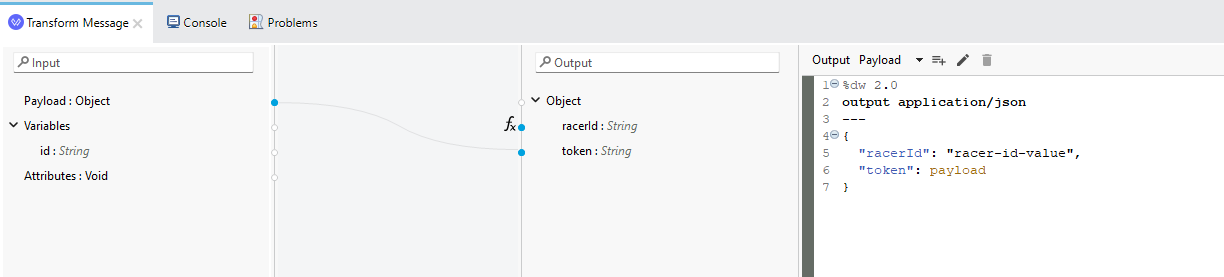 12. Drag a transform message and set the values as shown below. Replace the “race-id-value " with the value, received from the Anypoint Race API POST /register.