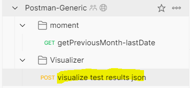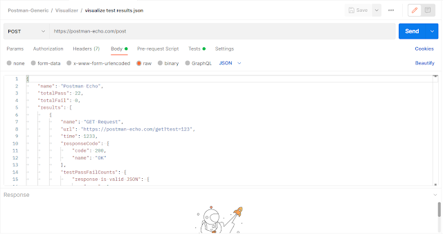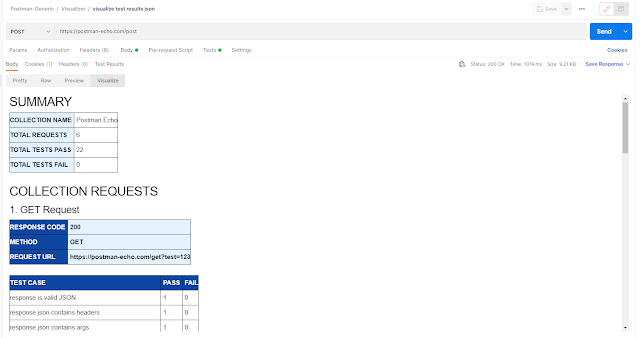 Postman Echo API can be used to echo our JSON test results export and pm.visualizer.set() function under the test tab of the Postman request can be used to populate the echoed data in HTML tags and visualize it.