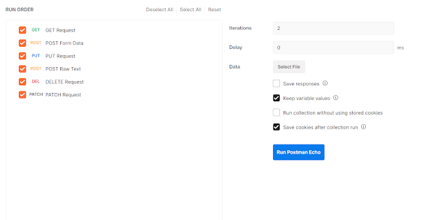 After selecting a collection to run, it will give various parameters to select. We can select as per our need. Once we click on Run <Collection Name>(Run Postman Echo)