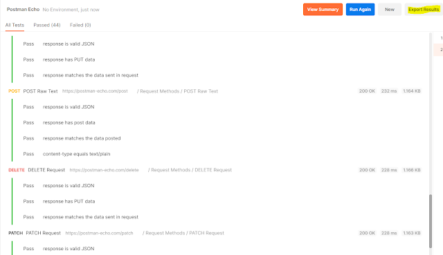 Once we run the Postman Collection, it will give us the output in a beautiful GUI layout. Now to save results, we have only one option i.e. to Export Results as highlighted in the above image.